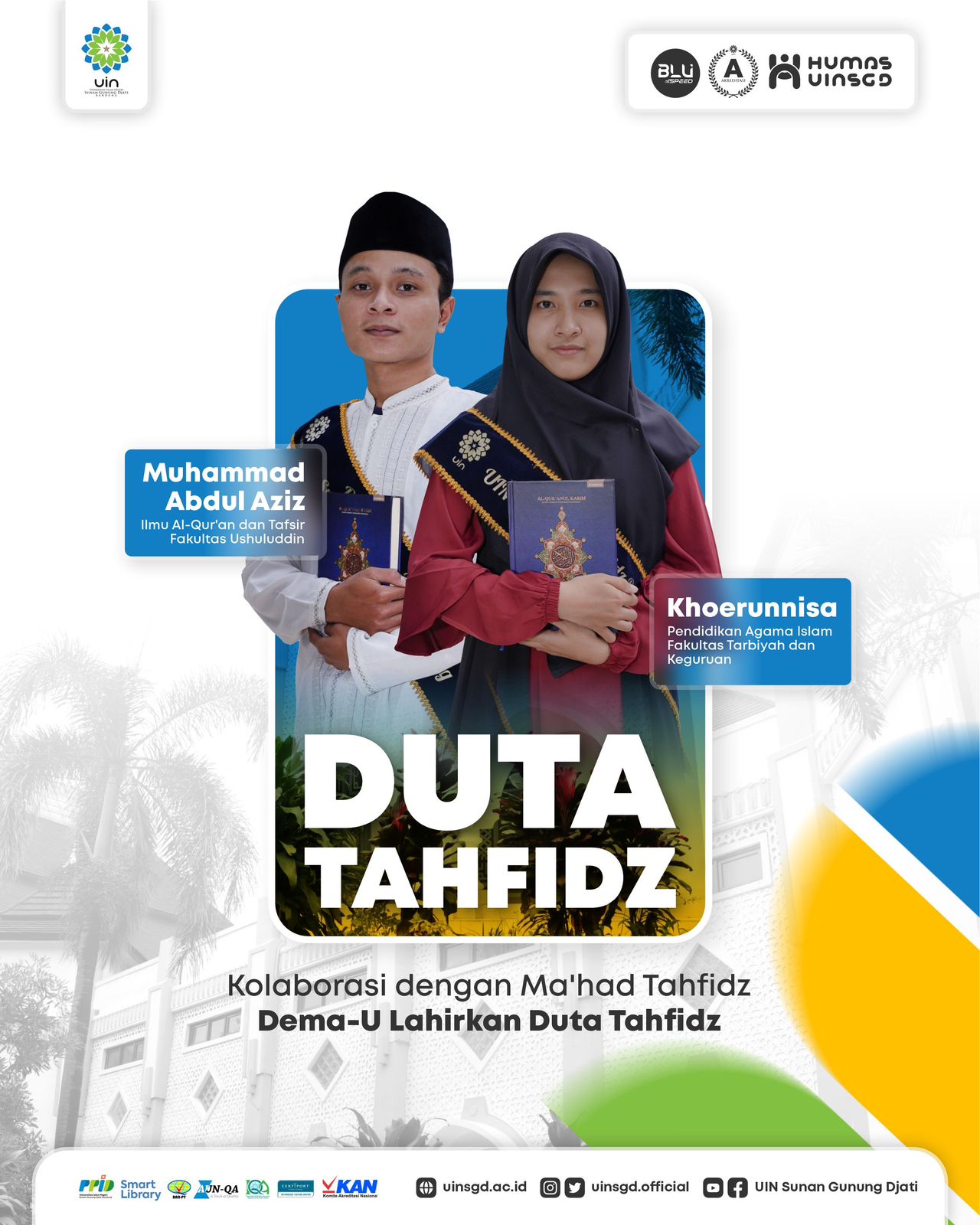 Kedua mahasiswa itu dinobatkan oleh Wakil Rektor III, Prof. Dr. H. Ah. Fathonih, M.Ag., sebagai Duta Tahfidz ialah Muhammad Abdul Aziz, mahasiswa Jurusan Ilmu Al-Qur’an dan Tafsir, Fakultas Ushuluddin dan Khoerunnisa, mahasiswa Jurusan Pendidikan Agama Islam, Fakultas Tarbiyah dan Keguruan.