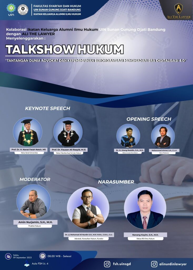 (UINSGD.AC.ID) — Ikatan Keluarga Alumni Ilmu Hukum (IKA-IH) Fakultas Syariah dan Hukum (FSH) UIN Sunan Gunung Djati Bandung menggelar Talkshow Hukum yang berlangsung di Aula FSH lantai IV, Sabtu (9/9/2023).