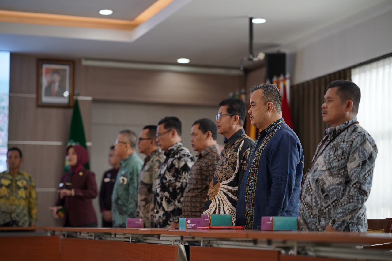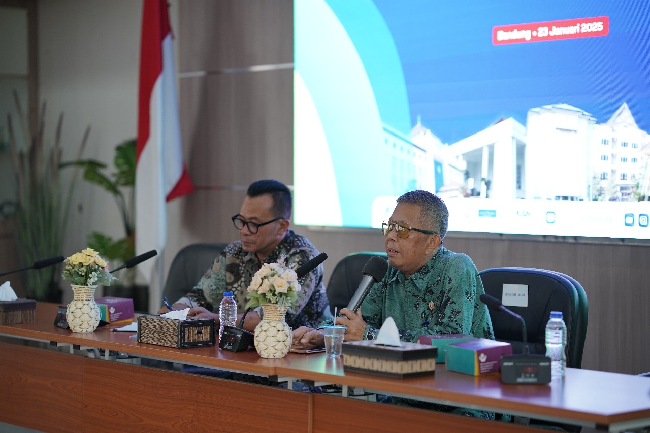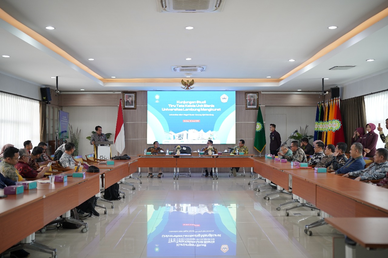 UINSGD.AC.ID (Humas) — Wakil Rektor II Bidang Administrasi Umum, Perencanaan dan Keuangan UIN Sunan Gunung Djati Bandung, Prof Dr H Tedi Priatna, M.Ag didampingi oleh Wakil Rektor III Bidang Kemahasiswaan dan Alumni Prof Dr Husnul Qodim, MA menerima Kunjungan Studi Tiru Tata Kelola Unit Bisnis Universitas Lambung Mangkurat (ULM) yang berlangsung di Gedung O. Djauharuddin AR, Kamis (23/1/2025).