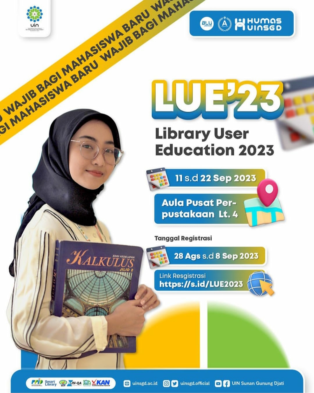 Pusat Perpustakaan UIN Sunan Gunung Djati Bandung mengadakan Library User Education Tahun Akademik 2023/2024 secara luring/offline pada tanggal 11- 22 September 2023. Kegiatan ini diwajibkan bagi mahasiswa baru UIN Sunan Gunung Djati Bandung Tahun Akademik 2023/2024. Pendaftaran dapat dilakukan melalui link https://s.id/LUE2023 pilih salah satu hari dan sesi yang sesuai dengan jadwal kuliah (jangan lupa menangkap gambar layar /screenshoot bukti pendaftaran).