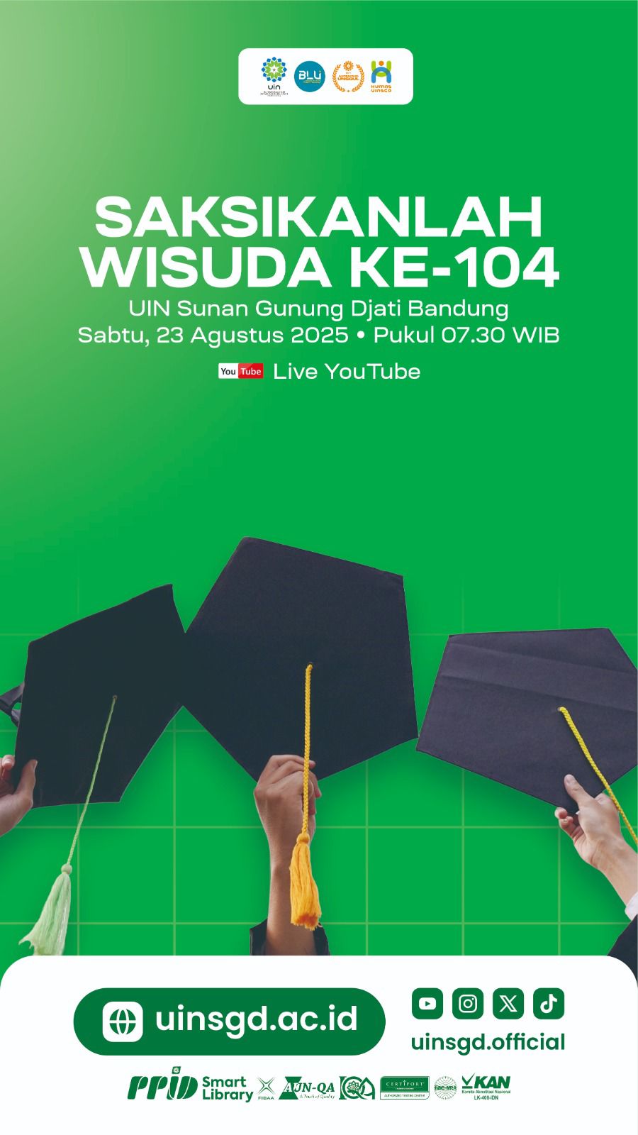 Jadilah saksi prosesi Sidang Senat Terbuka Wisuda ke-104 Lulusan Program Sarjana, Magister dan Doktor UIN Sunan Gunung Djati Bandung, yang disiarkan langsung melalui kanal Youtube UIN Sunan Gunung Djati Bandung.