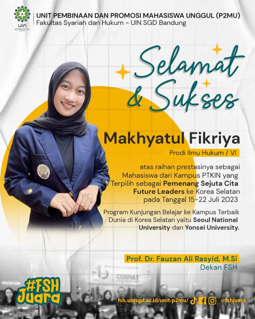 (UINSGD.AC.ID)-Makhyatul Fikriya, mahasiswa Program Studi Ilmu Hukum Fakultas Syariah dan Hukum (FSH) UIN Sunan Gunung Djati Bandung semester VI ini terpilih sebagai Pemenang Sejuta Cita Future Leader ke Korea Selatan pada tanggal 15-22 Juli 2023.