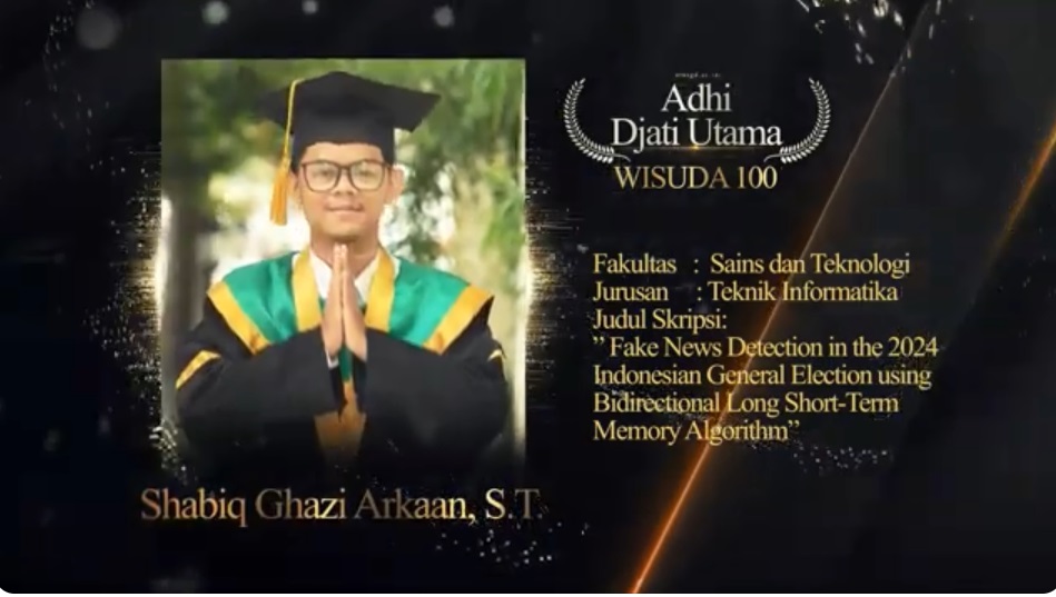 UINSGD.AC.ID (Humas) — Rektor UIN Sunan Gunung Djati Bandung Bandung, Prof. Dr. H. Rosihon Anwar, M.Ag., memberikan penghargaan kepada Shabiq Ghazi Arkaan, ST., Program Studi Teknik Informatika Fakultas Sains dan Teknologi (FST) IPK 3,97, sebagai Adhi Djati Utama pada Sidang Senat Terbuka Wisuda Ke-100 Lulusan Program Sarjana, Magister dan Doktor UIN Sunan Gunung Djati Bandung bertajuk “Melepas Dengan Harapan, Kembali Dengan Kepercayaan” yang berlangsung di Gedung Anwar Musaddad, Sabtu (26/10/2024).