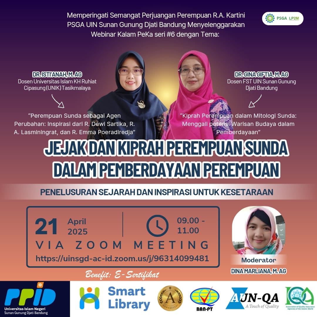 Sebab itulah, pada momen memperingati hari Kartini ini, Pusat Studi gender dan Anak (PSGA) UIN Sunan Gunung Djati Bandung menyelenggarakan Webinar dengan tema: Jejak dan Kiprah Perempuan Sunda dalam Pemberdayaan Perempuan: Penelusuran Sejarah dan Inspirasi untuk Kesetaraan. Webinar ini menghadirkan narasumber Dr. Gina Giftia menjelaskan tentang “Kiprah Perempuan dalam Mitologi Sunda: Menggali potensi Warisan Budaya dalam Pemberdayaan” dan Dr. Isti’anah yang menjelaskan tentang “Perempuan Sunda sebagai Agen Perubahan: Inspirasi dari R. Dewi Sartika, R. A. Lasminingrat, dan R. Emma Poeradiredja”