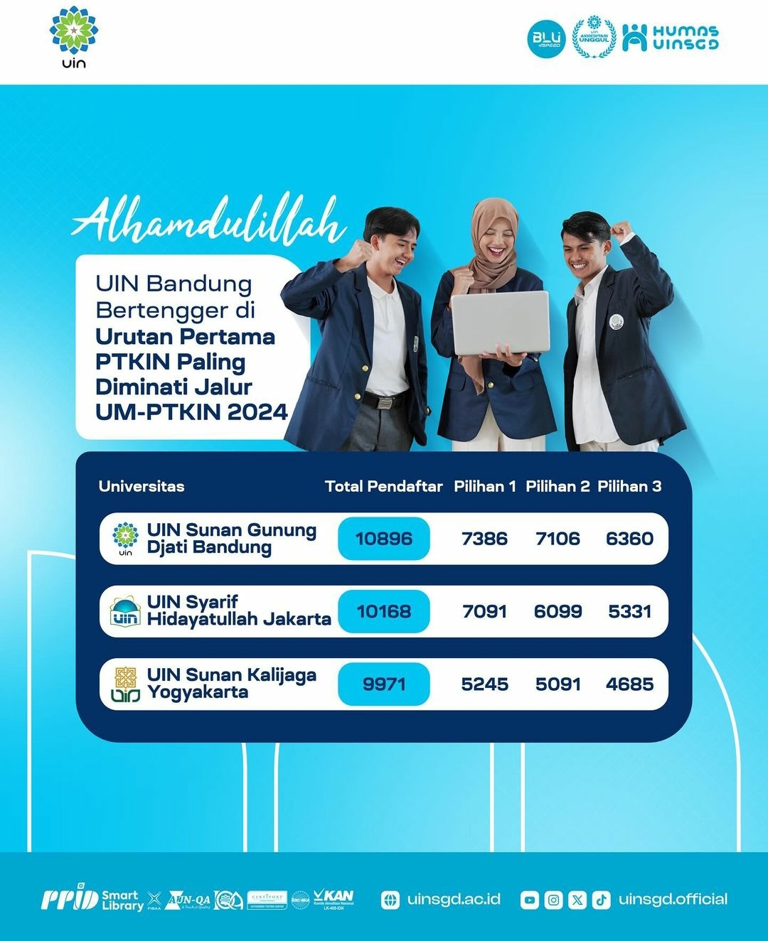 “Alhamdulillah UIN Sunan Gunung Djati menempati urutan 1 peminat jalur UM-PTKIN 2024, dari total pendaftar 10.896 siswa berhasil mendaftarkan diri ke UIN Bandung dengan rincian 6.084 peserta yang ujian SSE UM-PTKIN 2024 di Gedung PTIPD, termasuk didalamnya terdapat 9 peserta difabel. Ini menunjukkan bahwa UIN Bandung semakin mendapatkan tempat di masyarakat dan diminati oleh calon mahasiswa baru. Mudah-mudahan tingginya jumlah peminat dapat diikuti dengan peningkatan layanan prima, kualitas untuk mencerdaskan anak bangsa,” tegasnya.