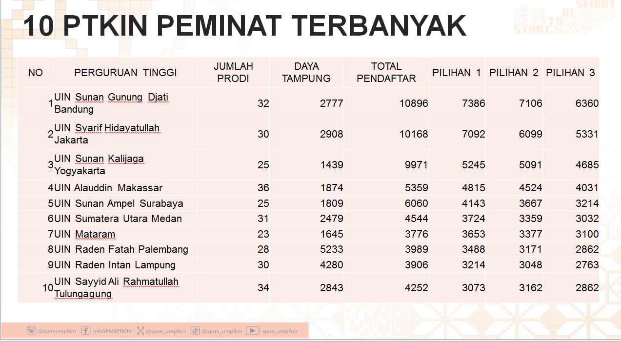 Berikut ini 10 Kampus dengan peminat terbanyak, UIN Sunan Gunung Djati Bandung dengan total pendaftar 10896 untuk 32 prodi, 2777 daya tampung, 7386 (pilihan 1), 7106 (pilihan 2) dan 6360 (pilihan 3); UIN Syarif Hidayatullah Jakarta dengan total pendaftar 10168 untuk 3o prodi, daya tampung 2908, 5245 (pilihan 1), 6099 (pilihan 2) dan 5331 (pilihan 3); UIN Sunan Kalijaga Yogyakarta dengan total pendaftar 9971, untuk 25 prodi, daya tampung 1439, 5245 (pilihan 1), 5091 (pilihan 2) dan 4685 (pilihan 3); UIN Alauddin Makassar dengan total pendaftar 5359 untuk 36 prodi, daya tampung 1874, 4815 (pilihan 1), 4524 (pilihan 2) dan 4031 (pilihan 3); UIN Sunan Ampel Surabaya dengan total pendaftar 6060 untuk 25 prodi, daya tampung 1809, 4143 (pilihan 1), 3667 (pilihan 2) dan 3214 (pilihan 3);
