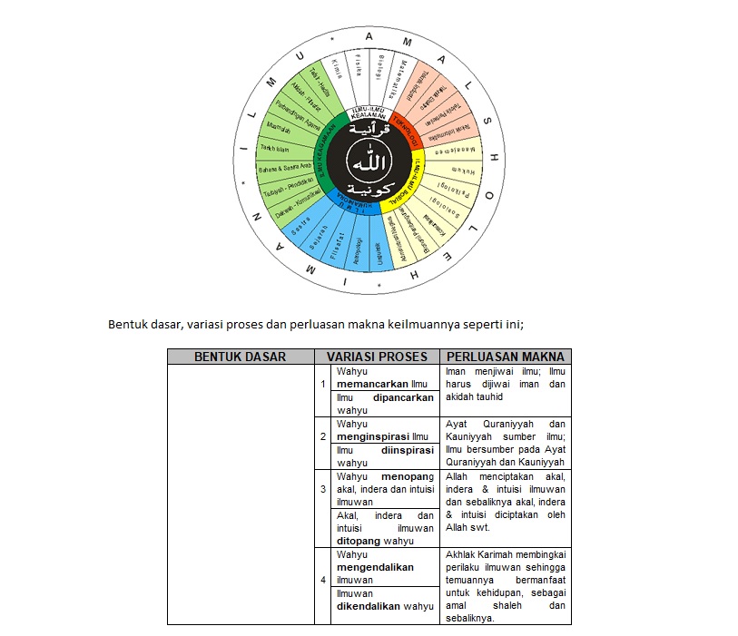 Konsep memandu sebanding dengan gaya sentrifugal. Sifat geraknya menjauhi pusat putaran. Pelaku utamanya adalah wahyu, firman Allah swt., (bentuk dasar A). Konsep dipandu sebanding dengan gaya sentripetal, sifat geraknya menuju pusat putaran yaitu wahyu. Gaya sentripetal memiliki efek berlawanan arah. Berarti ungkapan Wahyu Memandu Ilmu bisa bermakna bahwa ilmu harus dipandu oleh wahyu (bentuk dasar B).