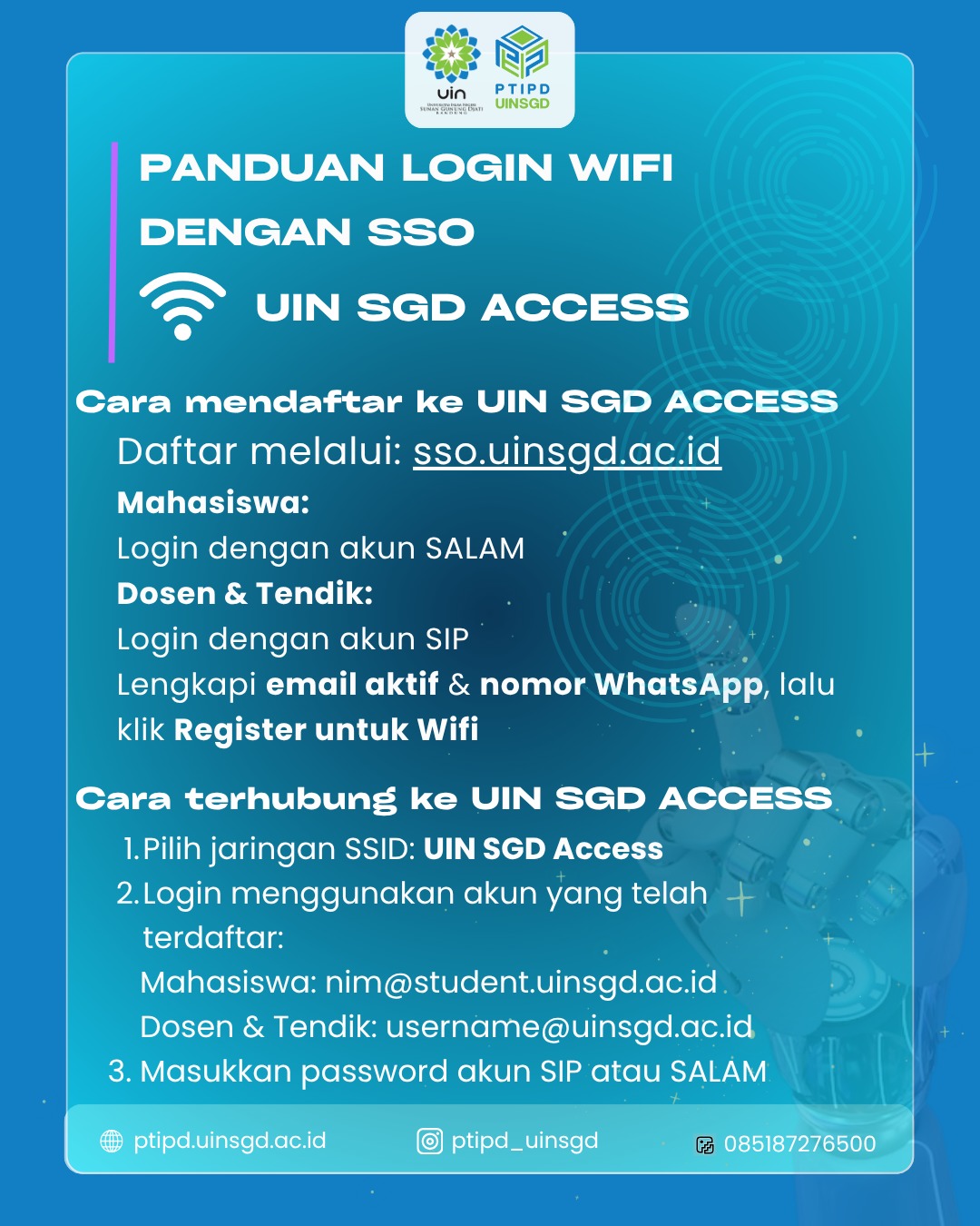 UINSGD.AC.ID (Humas) — UIN Sunan Gunung Djati Bandung Untuk dapat terhubung ke jaringan internet kampus melalui sistem Single Sign-On (SSO), seluruh civitas akademika UIN Sunan Gunung Djati Bandung wajib melakukan pendaftaran dan login melalui portal SSO UIN SGD.