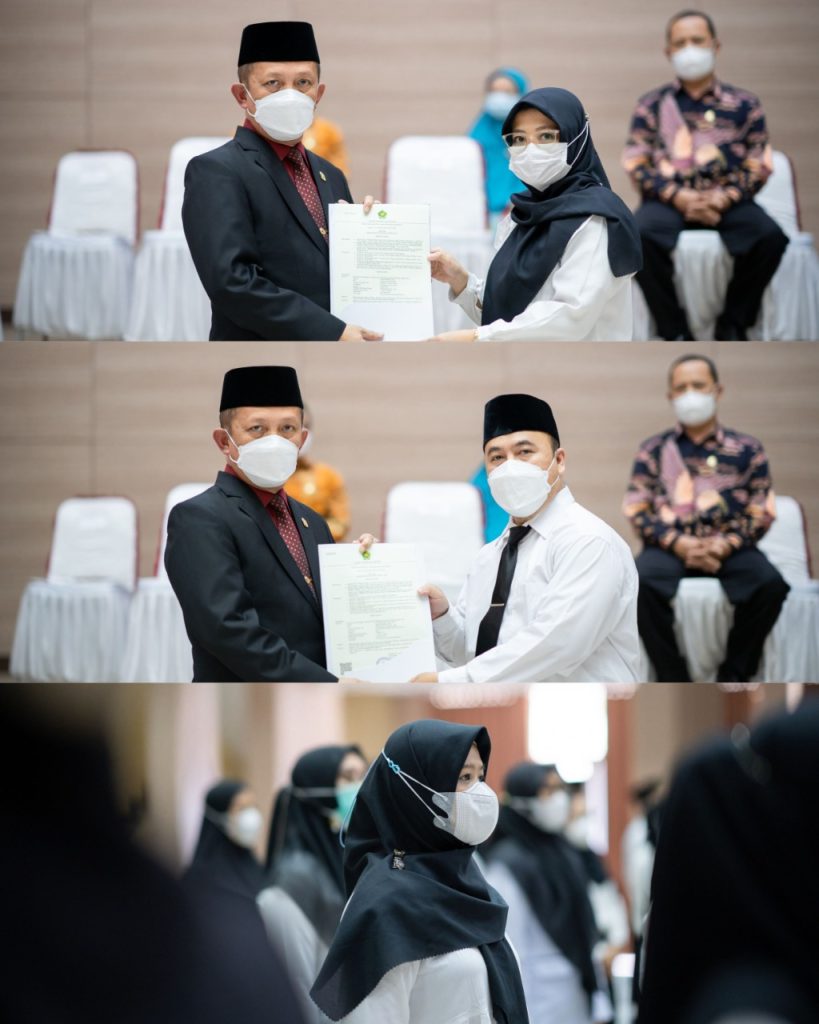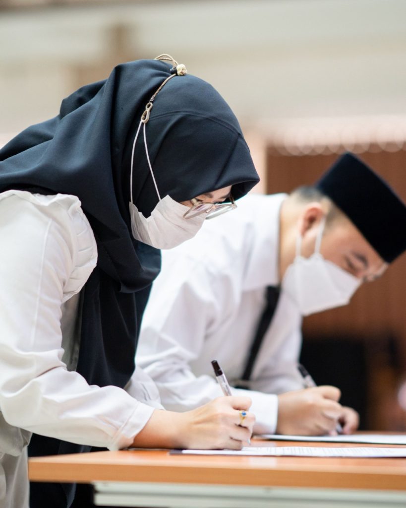 (UINSGD.AC.ID)-Sebanyak 70 peserta mengikuti Pengambilan Sumpah Pegawai Negeri Sipil, Pembinaan dan Penyerahan SK CPNS Formasi 2021 UIN Sunan Gunung Djati Bandung yang berlangsung di Aula Abdjan Soelaiman dengan tetap menerapkan Protokol Kesehatan, Rabu (23/03/2022).