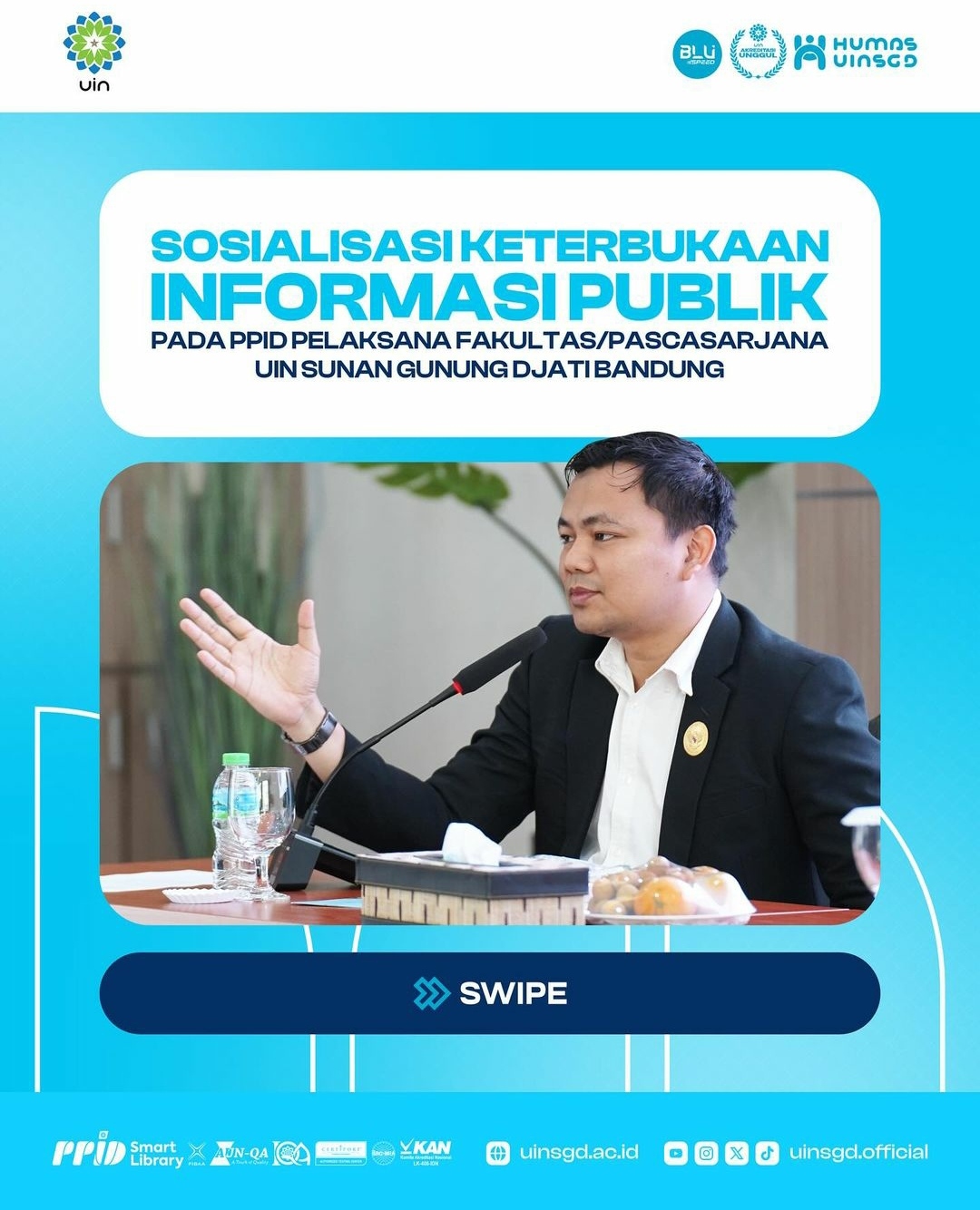 Keberadaan Pejabat Pengelola Informasi dan Dokumentasi (PPID) UIN Sunan Gunung Djati Bandung dibentuk dalam rangka memberikan pelayanan Informasi Publik sebagaimana diamanatkan dalam Peraturan Pemerintah Nomor 61 Tahun 2010 tentang Pelaksanaan Undang-Undang Nomor 4 Tahun 2008 tentang Keterbukaan Informasi Publik; Menteri Agama menetapkan Pejabat Pengelola informasi dan Dokumentasi (PPID) melalui Keputusan Menteri Agama (KMA) Nomor 200 Tahun 2012 tentang Pejabat Pengelola Informasi dan Dokumentasi (PPID) Kementerian Agama yang telah diperbaharui menjadi Keputusan Menteri Agama (KMA) Nomor 533 Tahun 2018 tentang Pejabat Pengelola Informasi dan Dokumentasi Kementerian Agama dan Atasan Pejabat Pengelola Informasi dan Dokumentasi Kementerian Agama; Keputusan Menteri Agama (KMA) Nomor 92 Tahun 2019 tentang Pedoman Layanan Informasi Publik bagi Pejabat Pengelola Informasi dan Dokumentasi (PPID) Kementerian Agama dan Atasan PPID Kementerian Agama; Keputusan Menteri Agama (PMA) Nomor 657 Tahun 2021 tentang Pejabat Pengelola Informasi dan Dokumentasi Kementerian Agama dan Atasan Pengelola Informasi dan Dokumentasi Kementerian Agama.