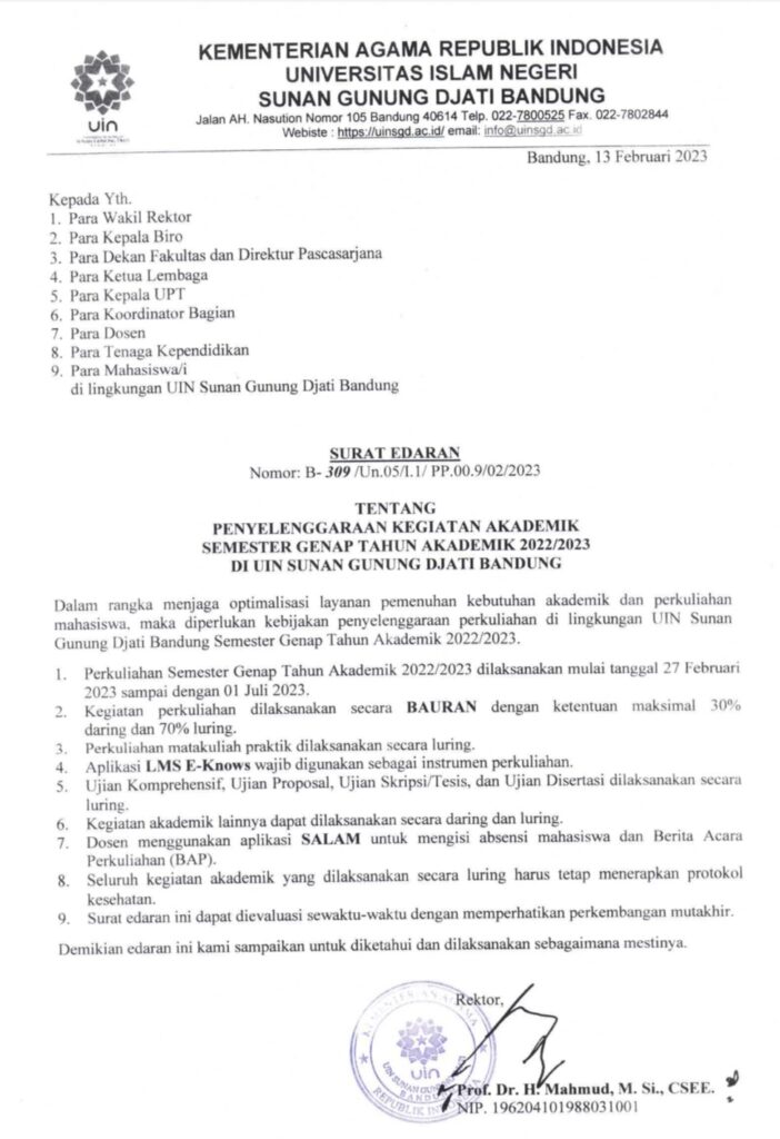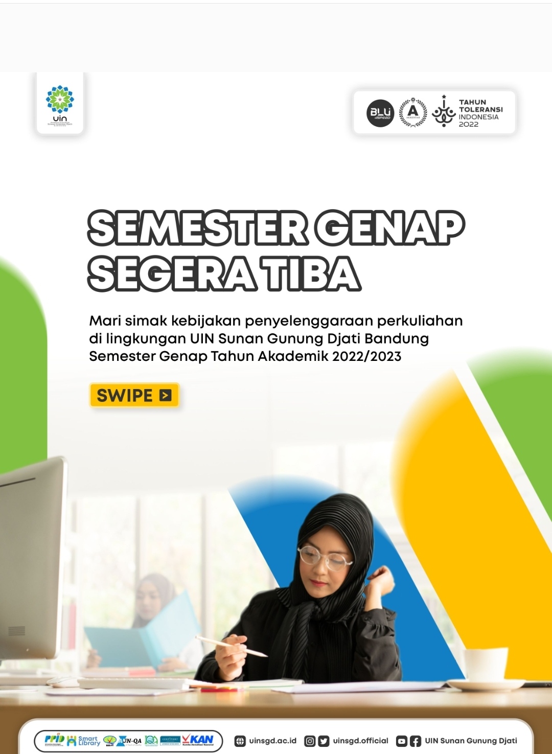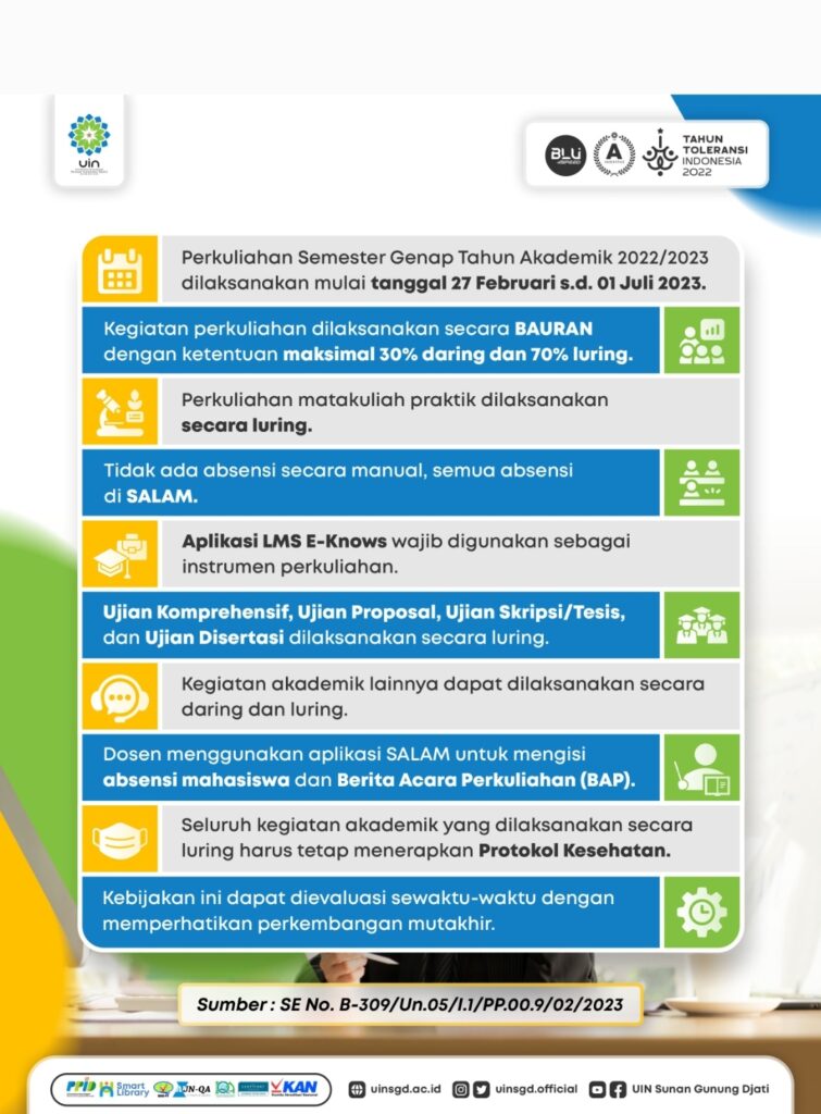 (UINSGD.AC.ID)-Untuk mengetahui penyelenggaraan kegiatan perkuliahan semester genap tahun akademik 2022/2023 dari tanggal 27 Februari sampai dengan 1 Juli 2023 dapat diunduh pada laman ini.