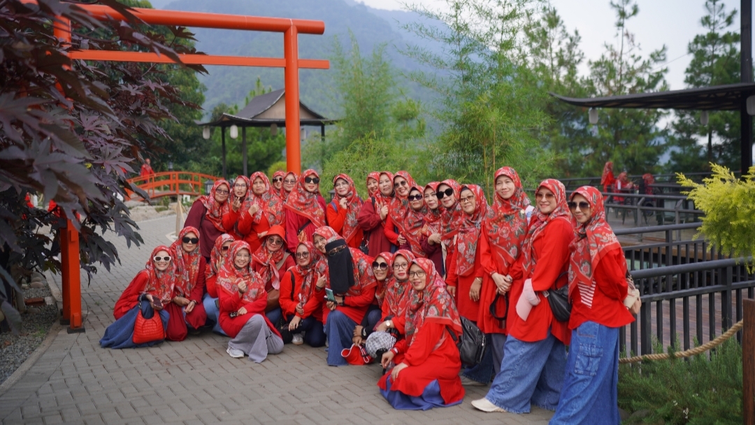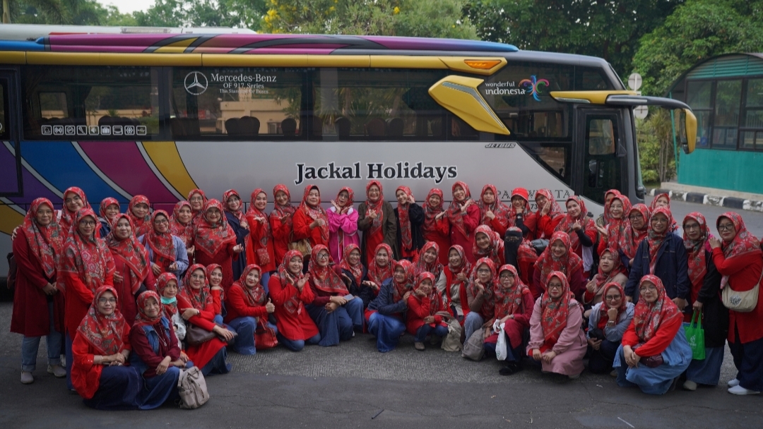 Rombongan tampak antusias dan kompak mengenakan kerudung bermotif merah, atasan merah, dan bawahan blue jeans. Suasana penuh keakraban ini menjadi awal yang menyenangkan sebelum perjalanan rihlah dimulai.