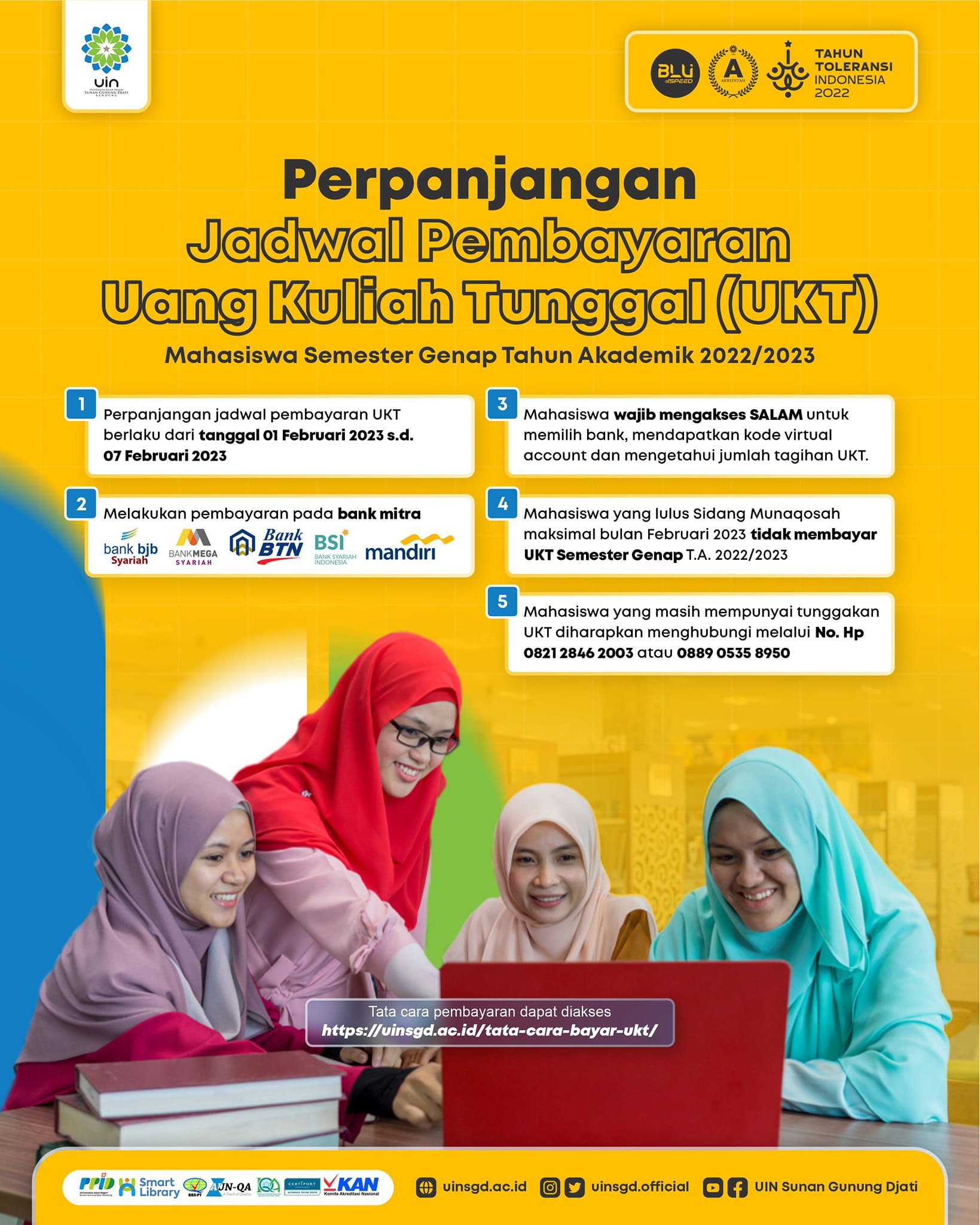 Berdasarkan kebijakan pimpinan, jadwal pembayaran Uang Kuliah Tunggal (UKT) diperpanjang sampai tanggal 7 Februari 2023. Pembayaran dapat dilakukan melalui bank yang ditunjuk oleh UIN Sunan Gunung Djati Bandung.