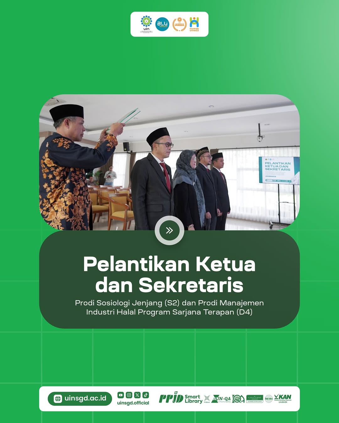 UINSGD.AC.ID (Humas) — Rektor UIN Sunan Gunung Djati Bandung, Prof. Dr. H. Rosihon Anwar, M.Ag., secara resmi melantik Ketua dan Sekretaris Program Studi Sosiologi jenjang S2; Program Studi Manajemen Industri Halal jenjang D4 yang berlangsung di Gedung O. Djauharuddin AR, Kamis (5/6/2025).