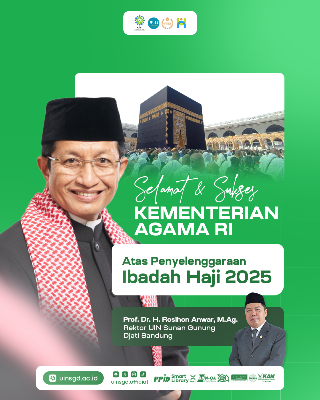 UINSGD.AC.ID (Humas) — Rektor UIN Sunan Gunung Djati Bandung, Prof. Dr. H. Rosihon Anwar, M.Ag., menyampaikan apresiasi setinggi-tingginya kepada seluruh pihak yang terlibat dalam penyelenggaraan ibadah haji tahun 2025, khususnya kepada Amirul Hajj dan jajarannya yang telah menunjukkan kinerja luar biasa dalam memastikan kelancaran, kenyamanan, dan keselamatan jamaah haji Indonesia.