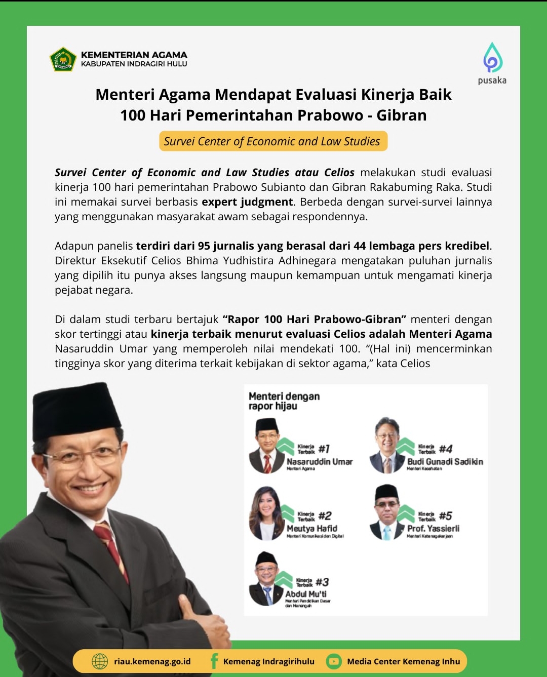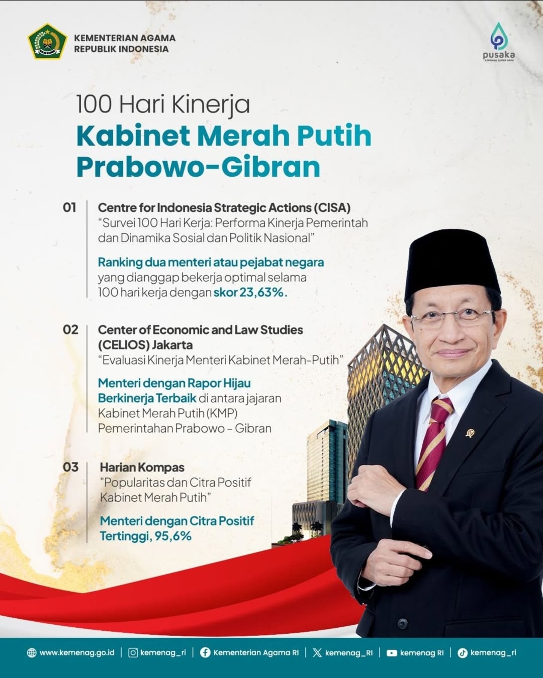 Hasil survei menunjukkan bahwa Menteri Agama, Nasaruddin Umar, memperoleh skor tertinggi sebagai menteri dengan kinerja terbaik, dengan nilai mendekati 100. Hal ini mencerminkan tinggi nya skor terkait kebijakan di sektor agama. Selain itu, Menag juga menempati posisi pertama dalam evaluasi Kinerja Menteri/Kepala Badan di Bidang Sosial dan Politik, serta meraih citra positif tertinggi dalam survei Harian Kompas pada Januari 2025.