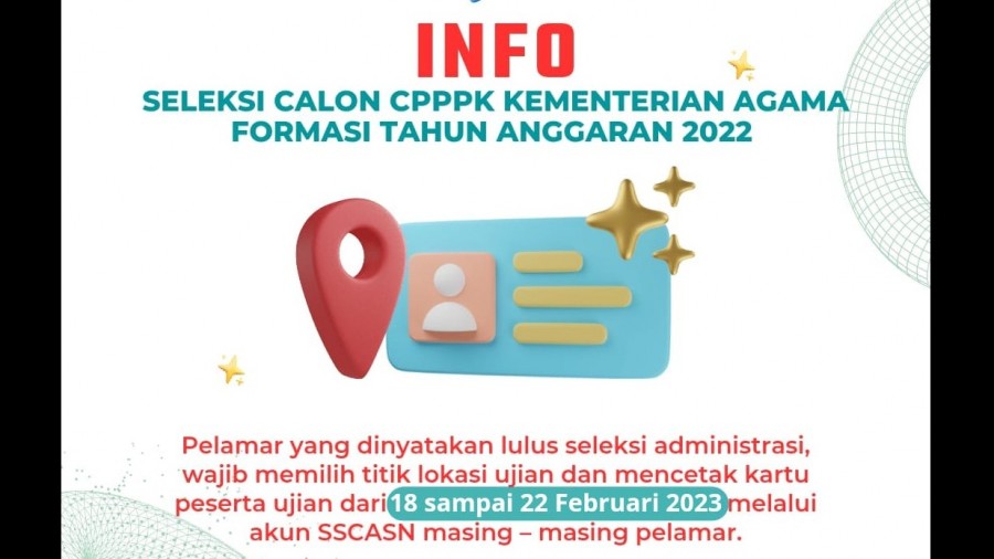 Selengkapnya, sila klik: Pengumuman Pemilihan Titik Lokasi Ujian dan Pencetakan Kartu Ujian Calon PPPK Kemenag Formasi Tahun Anggaran 2022