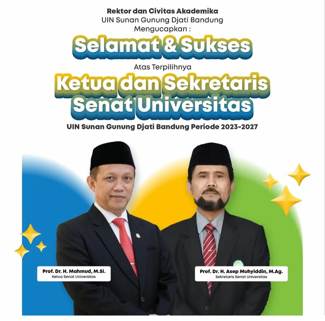 (UINSGD.AC.ID) — Rektor beserta civitas akademika UIN Sunan Gunung Djati Bandung mengucapkan selamat dan sukses atas terpilihnya Prof. Dr. H. Mahmud, M.Si. sebagai Ketua Senat Universitas dan Prof. Dr. H. Asep Muhyiddin, M.Ag. sebagai Sekretaris Senat Universitas. 😊🙏