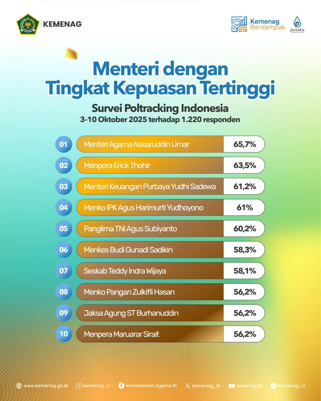 Berikut menteri dengan tingkat kepuasan tertinggi berdasarkan Survei Poltracking Indonesia, 3 – 10 Oktober 2025 terhadap 1.220 responden: