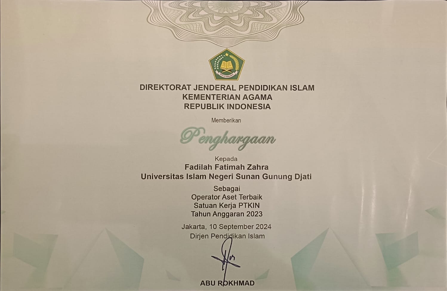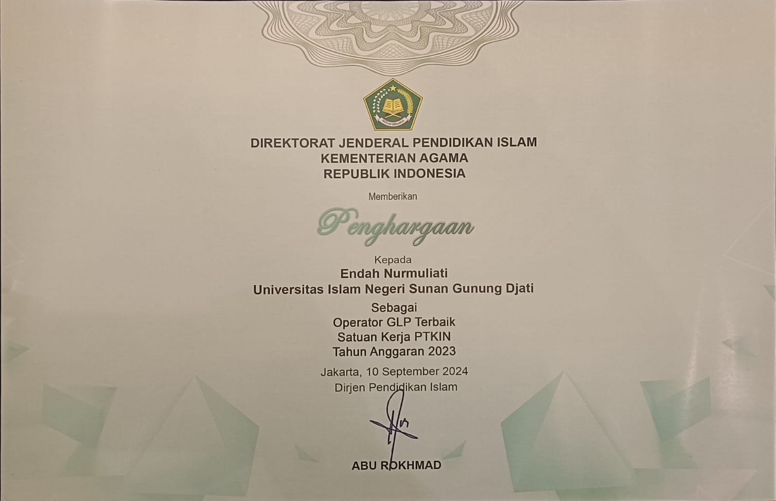 Pertama, Sebagai penyusun Laporan Keuangan Terbaik Satker PTKIN Tahun 2023; Kedua, sebagai Operator GLP Terbaik Satuan PTKIN Tahun 2023 atas nama Endah Nurmuliati, M.Pd.; Ketiga, sebagai Operator Terbaik Satker PTKIN 2023 atas nama Fadilah Fatimah Zahra, SE. Kami hatur kan Terimakasih kepada Bapak Rektor, Para Wakil Rektor, khususnya Wakil Rektor 2, Para Kepala Biro, para Ketua Tim Kerja, terutama Keuangan serta Civitas Akademika atas support dan kerjasamanya. Barokalloh, sukses buat kita semua,” tegasnya, Sabtu (28/9/2024).