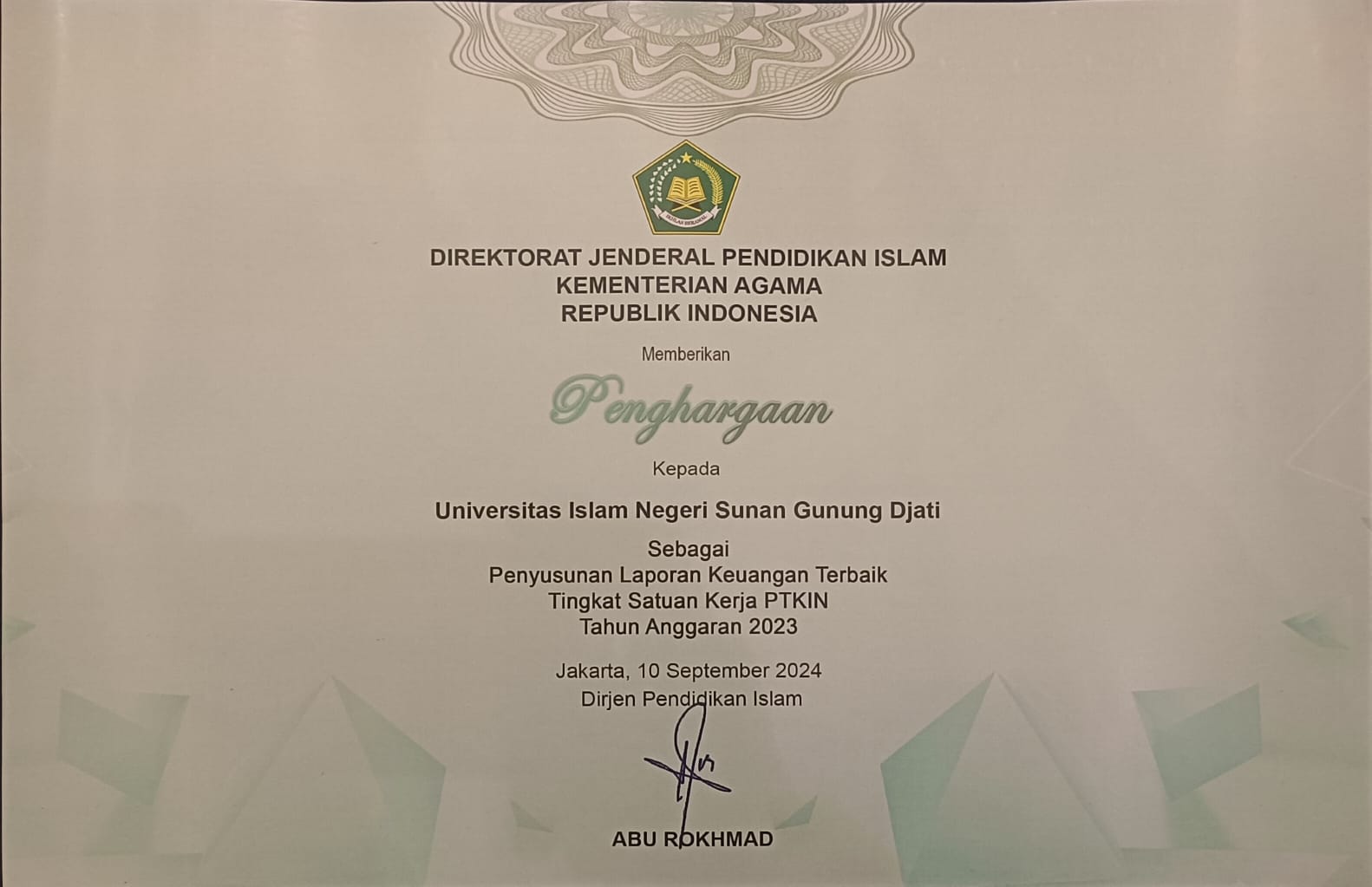 UINSGD.AC.ID (Humas) — Direktur Jenderal Pendidikan Islam Kementerian Agama RI, Prof Abu Rokhmad memberikan penghargaan kepada UIN Bandung sebagai Penyusunan Laporan Keuangan Terbaik Tingkat Satuan Kerja Perguruan Tinggi Keagamaan Islam Negeri (PTKIN) tahun anggaran 2023 yang berlangsung di Batam pada Rabu (25/9/2024).