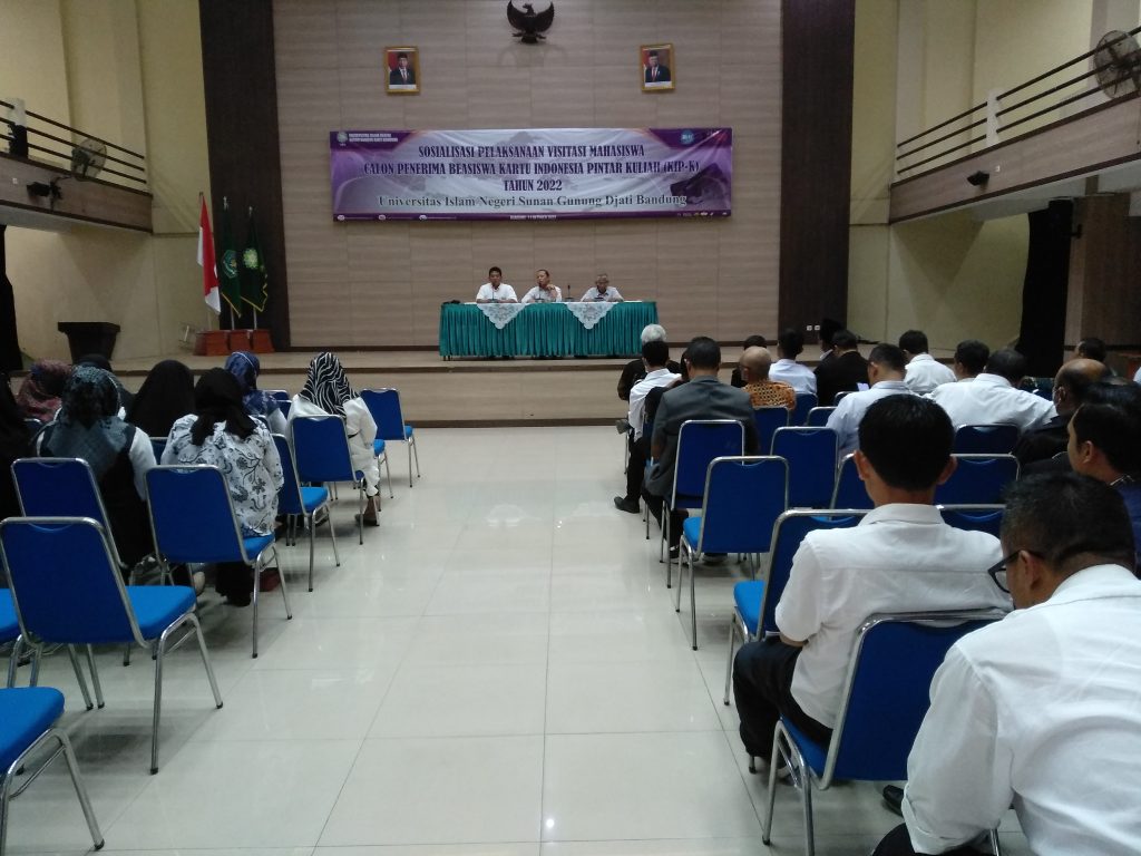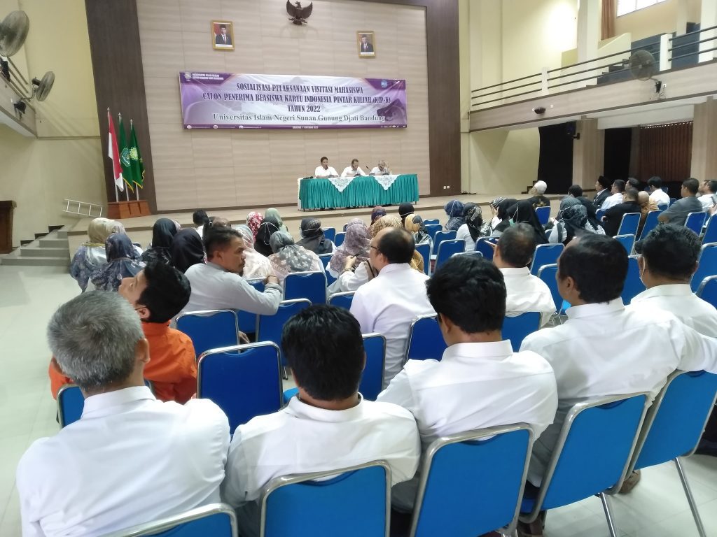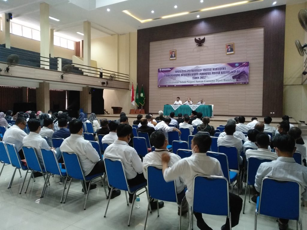 (UINSGD.AC.ID)-Bagian Kemahasiswaan dan Alumni UIN Sunan Gunung Djati Bandung menggelar Sosialisasi Pelaksanaan Visitasi Mahasiswa Calon Penerima Beasiswa Kartu Indonesia Pintar Kuliah (KIP-K) tahun 2022 yang dibuka oleh Wakil Rektor III, Prof Dr H. Ah. Fathonih, M.Ag didampingi Kepala Biro Administrasi Akademik, Kemahasiswaan, dan Kerjasama (A2KK), Drs. H. Khoirudin, M.M di gedung Abdjan Solaeman, Selasa (11/10/2022).