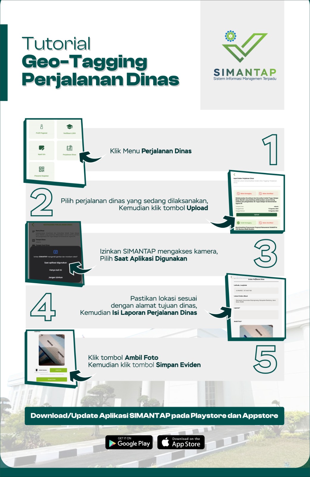 UINSGD.AC.ID (Humas) — Dalam rangka tertib administrasi perjalanan dinas di lingkungan Universitas Islam Negeri Sunan Gunung Djati Bandung, dengan ini kami menghimbau kepada seluruh pegawai di lingkungan Universitas Islam Negeri Sunan Gunung Djati Bandung yang melaksanakan perjalan dinas agar Geo-Tagging, mengisi laporan perjalan dinas dan mengunggah foto pada aplikasi SIMANTAP, sebagaimana tutorial terlampir.