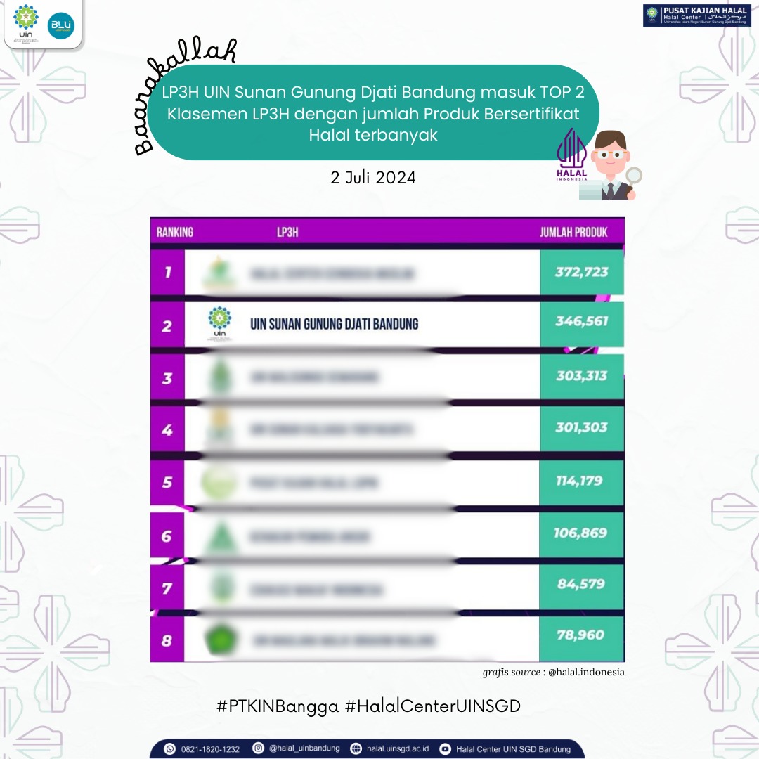 Berdasarkan data terbaru dari Badan Penyelenggara Jaminan Produk Halal (BPJPH) Kementerian Agama RI, LP3H UIN Bandung berhasil menempati posisi kedua di antara 8 lembaga teratas yang mendampingi proses sertifikasi produk halal secara nasional.