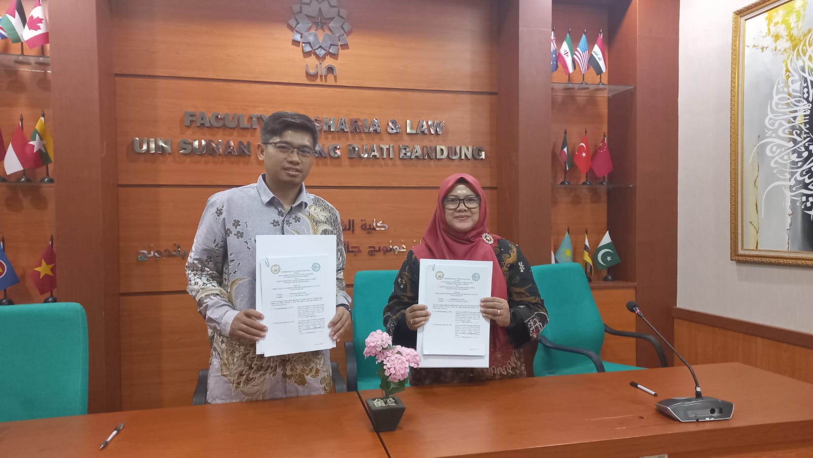 Ketua PKBH UIN SSC, H. Ahmad Khoirudin, Lc., M.H., menandatangani MoU sebagai pihak pertama, sedangkan Ketua JDIH UIN Bandung, H. Dewi Mayaningsih, S.H., M.H., bertindak atas nama pihak kedua.