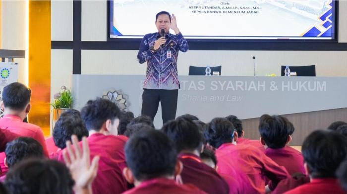 Dengan menghadirkan Asep Sutandar, A.Md.I.P., S.Sos., M.Si., Kepala Kantor Wilayah Kementerian Hukum Provinsi Jawa Barat, sebagai narasumber utama. Turut hadir Prof. Dr. H. Fauzan Ali Rasyid, M.Si., Dekan Fakultas Syariah dan Hukum; Dr. H. Burhanuddin, SAg., MH., Wakil Dekan III FSH; Ende Habib Nasaruddin, S.H., M.H., Ketua Jurusan Ilmu Hukum; dan Dian Rachmat Gumelar, S.H., M.H., Sekretaris Jurusan Ilmu Hukum.