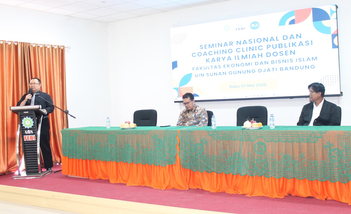 Seminar Nasional dan Coaching Clinic Publikasi Karya Ilmiah Dosen itu dibuka oleh Wakil Dekan I FEBI, Dr. Iwan Setiawan, M.Pd., M.E.S yang mewakili Dekan Prof. Dr. H. Dudang Gojali, M.Ag.