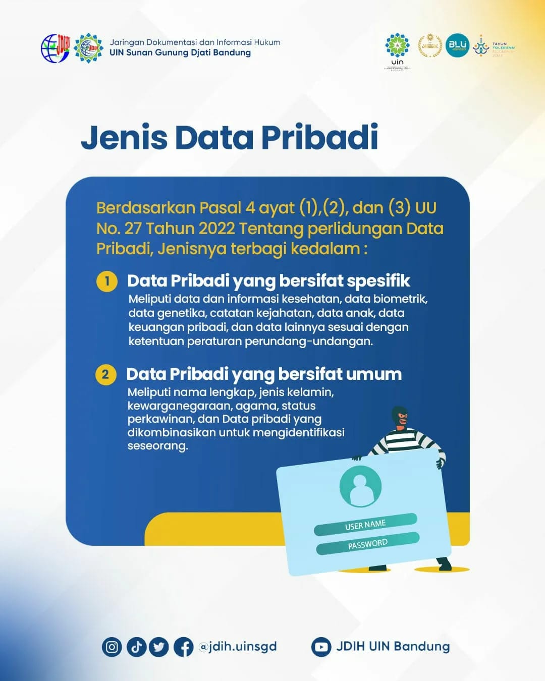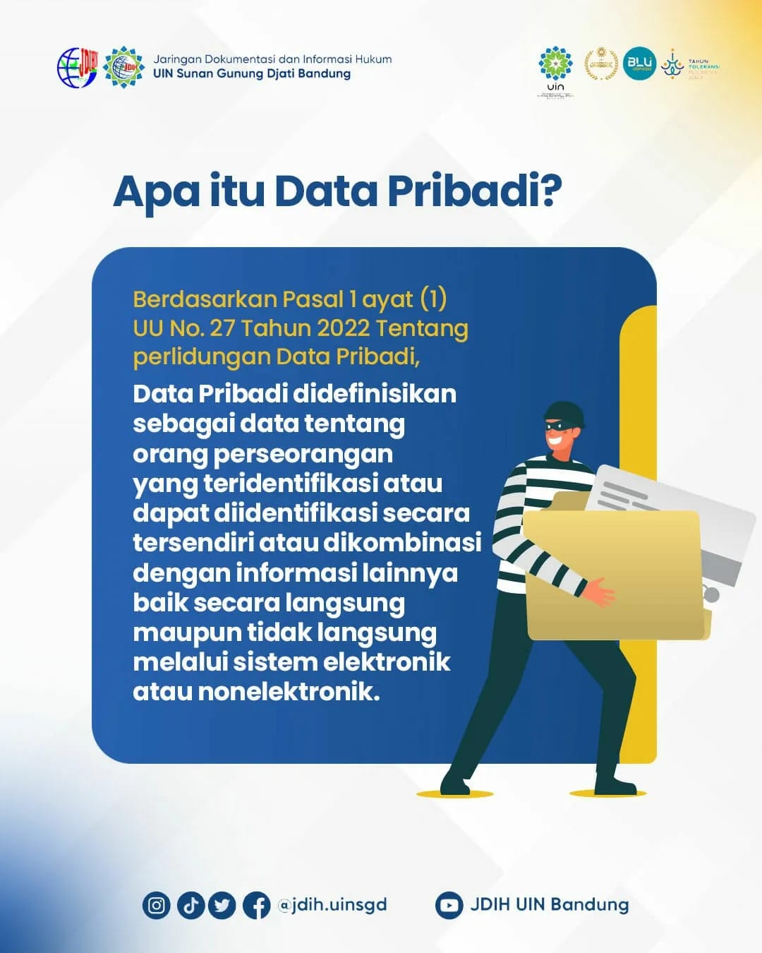 UINSGD.AC.ID (Humas) — Sejak Tahun 2022 kita sudah mempunyai aturan terkait Perlindungan Data Pribadi (PDP) yaitu Undang-Undang Nomor 27 Tahun 2022 tentang Perlindungan Data Pribadi (UU PDP)
