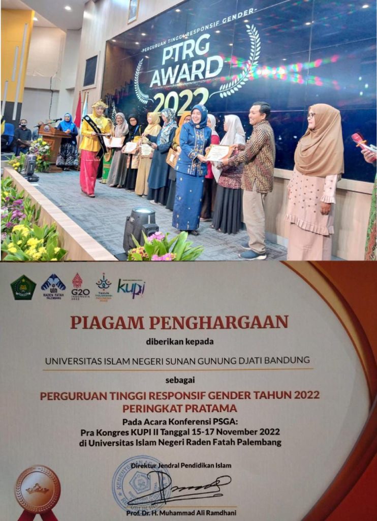 (UINSGD.AC.ID)-Kementerian Agama RI melalui Direktorat Pendidikan Tinggi Keagamaan Islam Ditjen Pendidikan Islam menyelenggaraan Perguruan Tinggi Responsif Gender (PTRG) Award. Kegiatan PTRG Award diselenggarakan dalam event Konferensi PSGA (Pusat Studi Gender dan Anak) tahun 2022 yang digelar di UIN Raden Fatah, Palembang sejak Selasa-Kamis (15-17/11/2022).