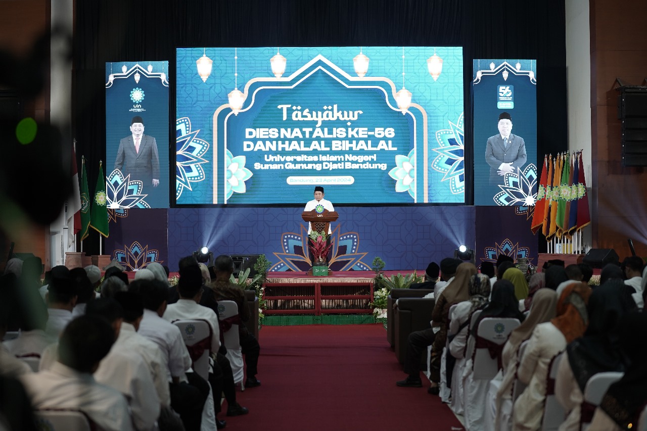 UINSGD.AC.ID (Kampus I) — Dalam rangka memperingati hari lahir, saling bermaafan atas segala khilaf dan dosa, UIN Sunan Gunung Djati Bandung menggelar Tasyakur Dies Natalis ke-56 dan Halalbihalal yang berlangsung di gedung Anwar Musaddad, Selasa (23/4/2024).