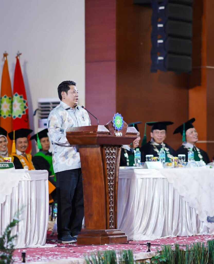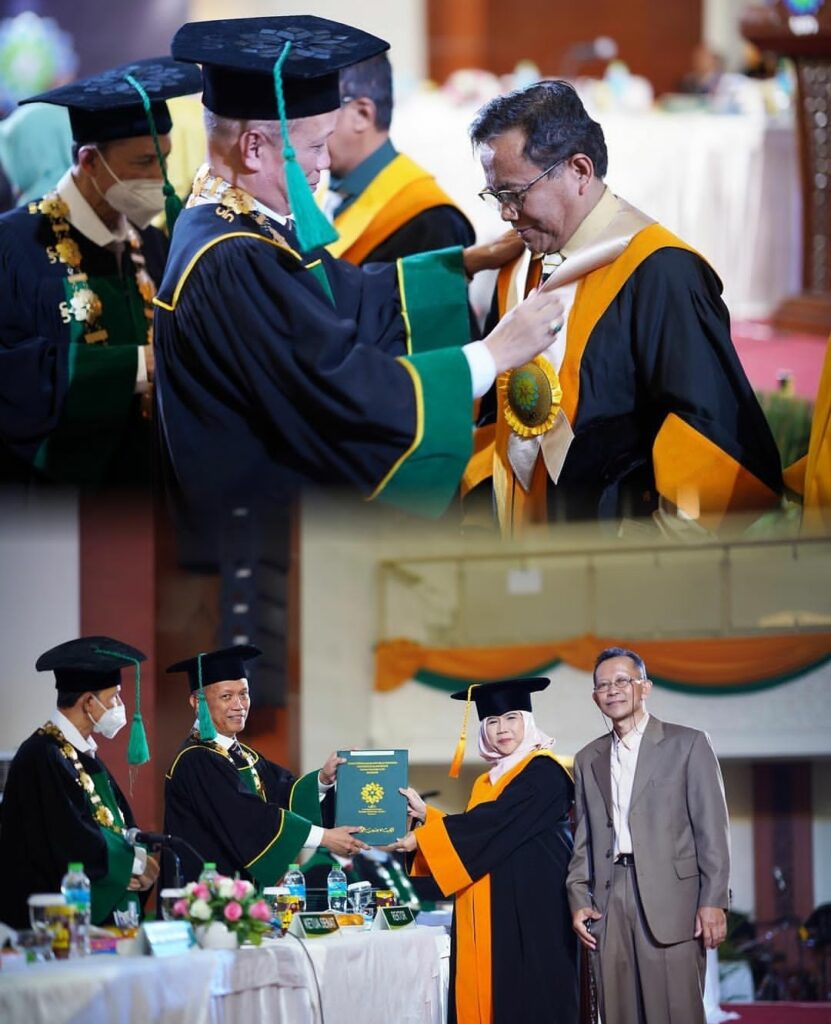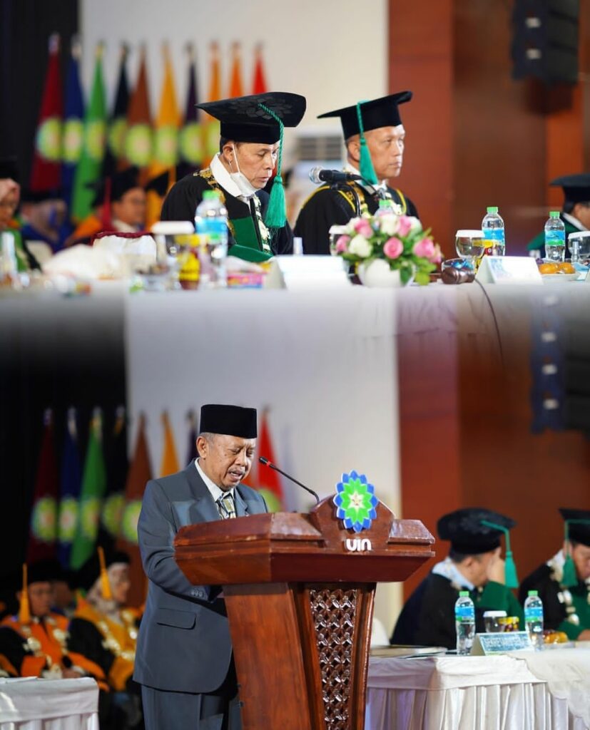 “Sejatinya 22, karena 2 guru besar baru kemarin keluarnya. Jadi yang dikukuhkan hari hanya 20 guru besar. 2 lagi untuk rektor baru. Tentunya ini tidak lepas dari anugerah Allah SWT, atas bimbingan, arahan, dukungan dari Pa Dirjen, Pa Direktur, Pa Balitbang, sehingga bertambah guru besar jadi 72. Selamat. Semoga kehadiran saudara jadi lambang perguruan tinggi, teladan kampus. Saya titip mari kita sama-sama tampil mempesona, sebagai guru besar harus bijak dalam berucap, bertindak dan berusaha untuk menghadirkan perilaku Islami. Jika tidak terkontrol, sepak terjang mencoreng guru besar,” ujarnya.