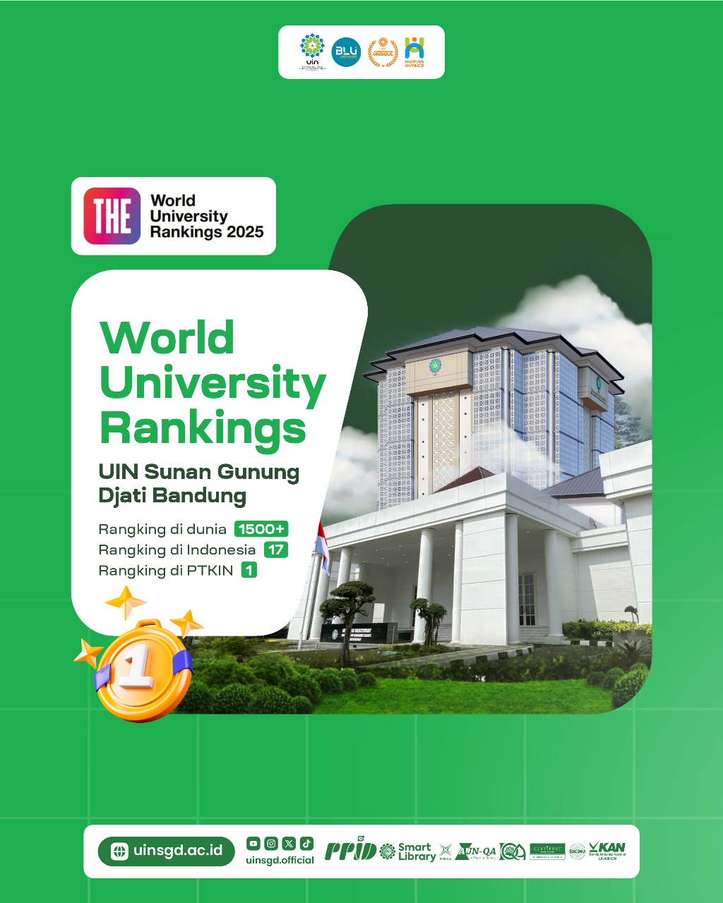 Secara nasional, UIN Bandung berada di peringkat ke-17 di Indonesia, dan secara global masuk dalam klaster 1501+ dunia. Capaian ini menjadi bukti konkret dari komitmen kampus dalam meningkatkan mutu akademik, riset, serta tata kelola pendidikan tinggi berbasis internasionalisasi.