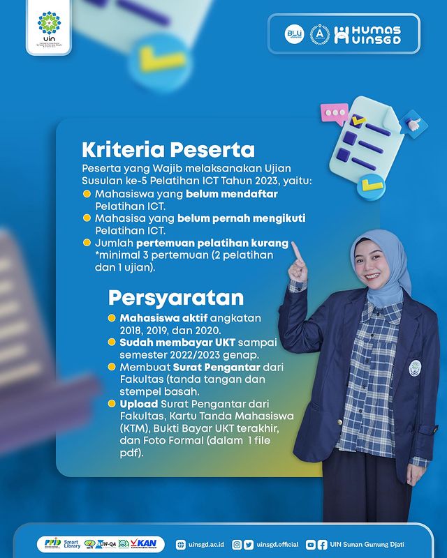 Panggilan khusus untuk teman-teman angkatan 2018, 2019 dan 2020 yang belum melaksanakan Ujian ICT, telah dibuka kembali Ujian Susulan ke-5 yang diselenggarakan oleh Pusat Teknologi Informasi dan Pangkalan Data (PTIPD) UIN Sunan Gunung Djati Bandung.