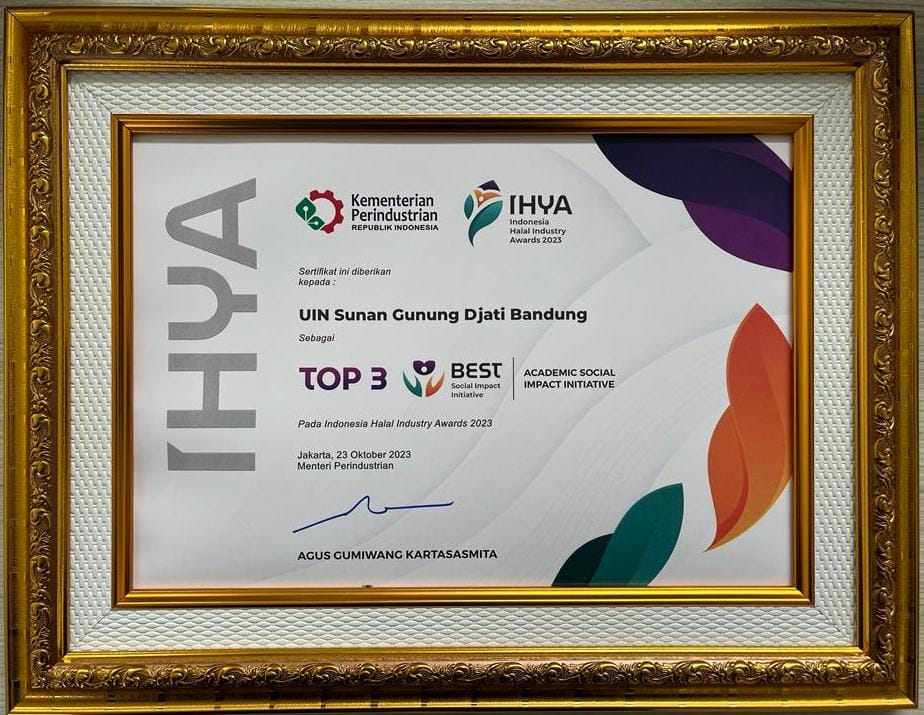(UINSGD.AC.ID) — UIN Sunan Gunung Djati Bandung dianugerahi penghargaan sebagai ‘TOP 3 Best Social Impact Initiative (Acedemic Social Impact Initiative)’ dalam acara Indonesia Halal Industry Awards (IHYA) 2023 yang diselenggarakan oleh Pusat Pemberdayaan Industri Halal – Kementerian Perindustrian Republik Indonesia.