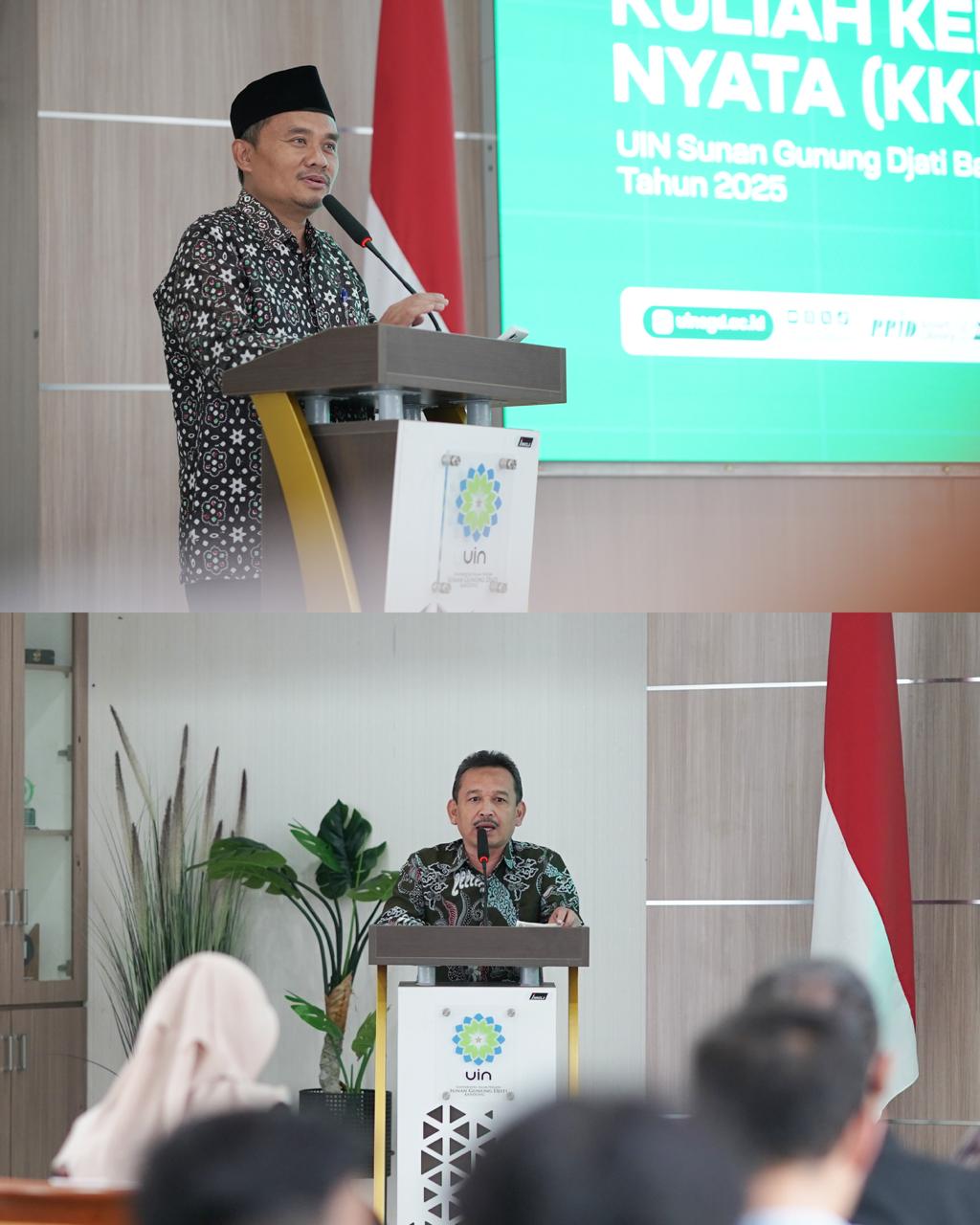 UINSGD.AC.ID (Humas) — Wakil Rektor I UIN Sunan Gunung Djati Bandung, Prof. Dr. H. Dadan Rusmana, M.Ag., didampingi Ketua Lembaga Penelitian dan Pengabdian kepada Masyarakat (LP2M), Dr. H. Setia Gumilar, S.Ag., M.Hum., secara resmi melepas peserta Kuliah Kerja Nyata (KKN) Tahun 2025. Prosesi pelepasan digelar secara hibrid, melalui Zoom Meeting dan luring di Gedung O. Djauharuddin AR, Jumat (18/7/2025).