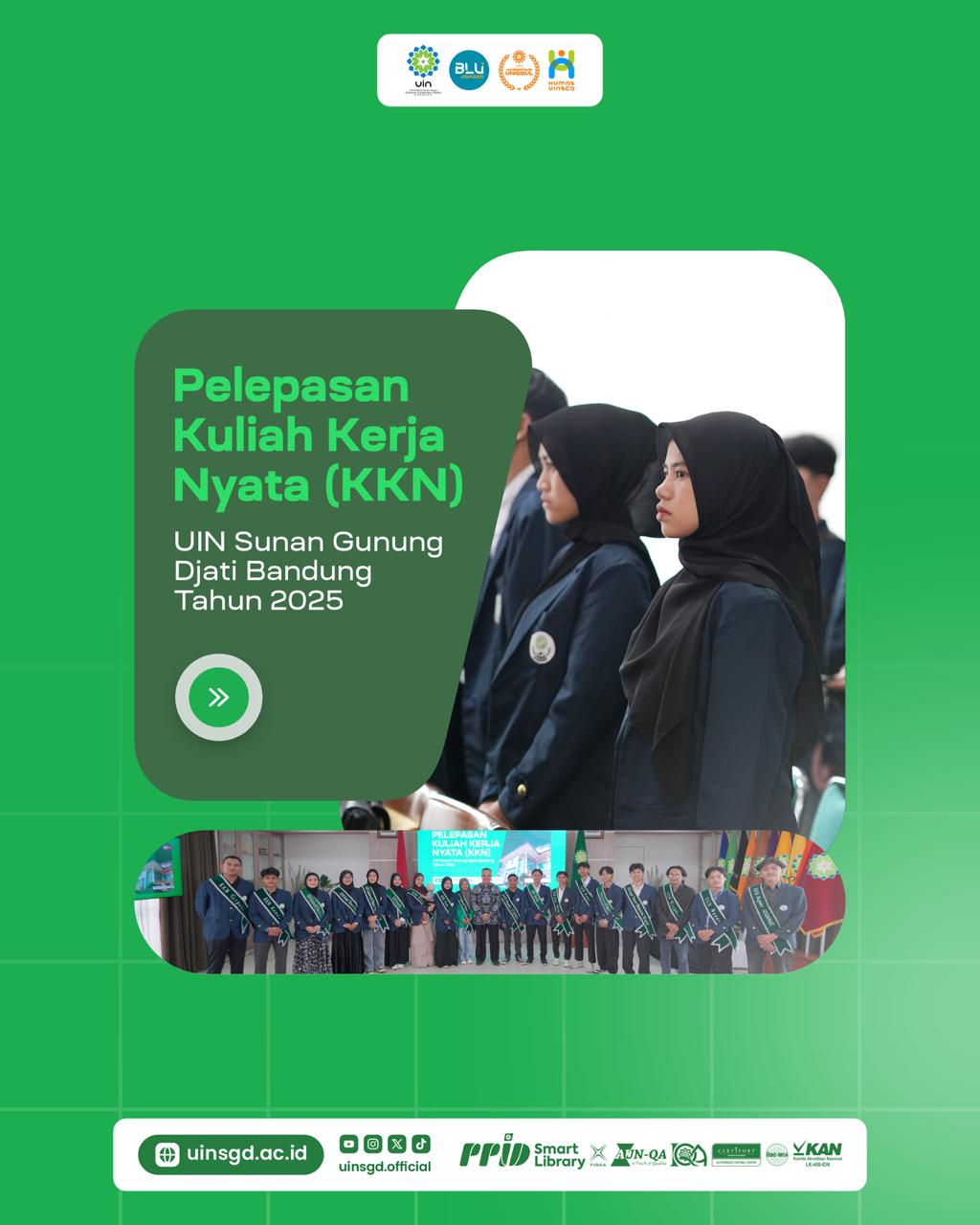 KKN ORDA Mitra Pemda Luar Jabar 135 (Orda Mataram, Orda Jatim, Orda Minang) dan KKN Orda Mitra Pemda Wilayah Jabar sebanyak 1.035 orang; KKN Responsif 14; KKN Konversi 15; KKN Tematik Halal 160, Moderasi Beragama 45, dan Sadar Hukum 30; KKN Terpadu 90; KKN Nusantara MB 10; KKN Kolaborasi Dosen-Mahasiswa Mengabdi 10; dan KKN Reguler Sisdamas 4.908.