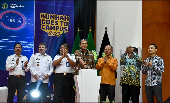 (UINSGD.AC.ID)-Wakil Menteri Hukum dan Hak Asasi Manusia RI, Prof. Dr. Edward Omar Sharif Hiariej, SH., M.Hum didampingi Kepala Kantor Kemenkumham Jabar, R. Andika Dwi Prasetya, Rektor UIN Bandung, Prof Dr H Mahmud MSi CSEE, Dekan Fakultas Syariah dan Hukum (FSH), Prof Dr Fauzan Ali Rasyid MSi., Kepala Pusat JDIHN, Nofli, Kepala Divisi Pelayanan Hukum dan HAM Jabar, Andi Taletting Langi, Ketua JDIH UIN Bandung, Dian Rachmat Gumelar, S.H., M.H., meresmikan Jaringan Dokumentasi dan Informasi Hukum (JDIH) UIN Sunan Gunung Djati Bandung dalam Kumham Goes To Campus yang berlangsung Gedung Anwar Musaddad, Rabu (5/4/2023).