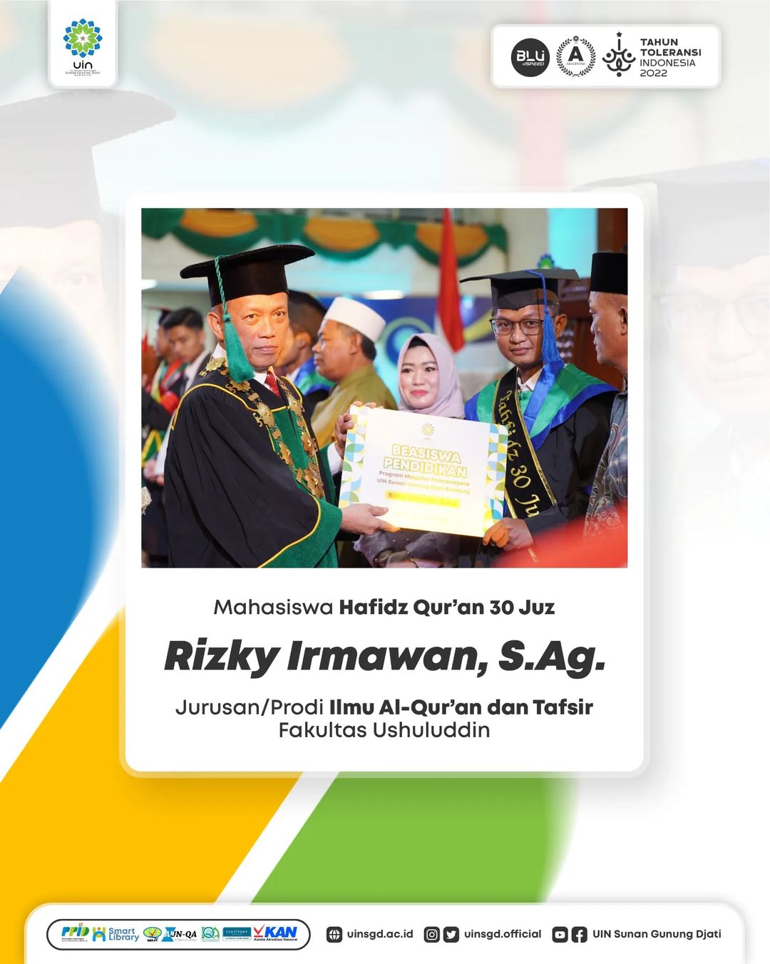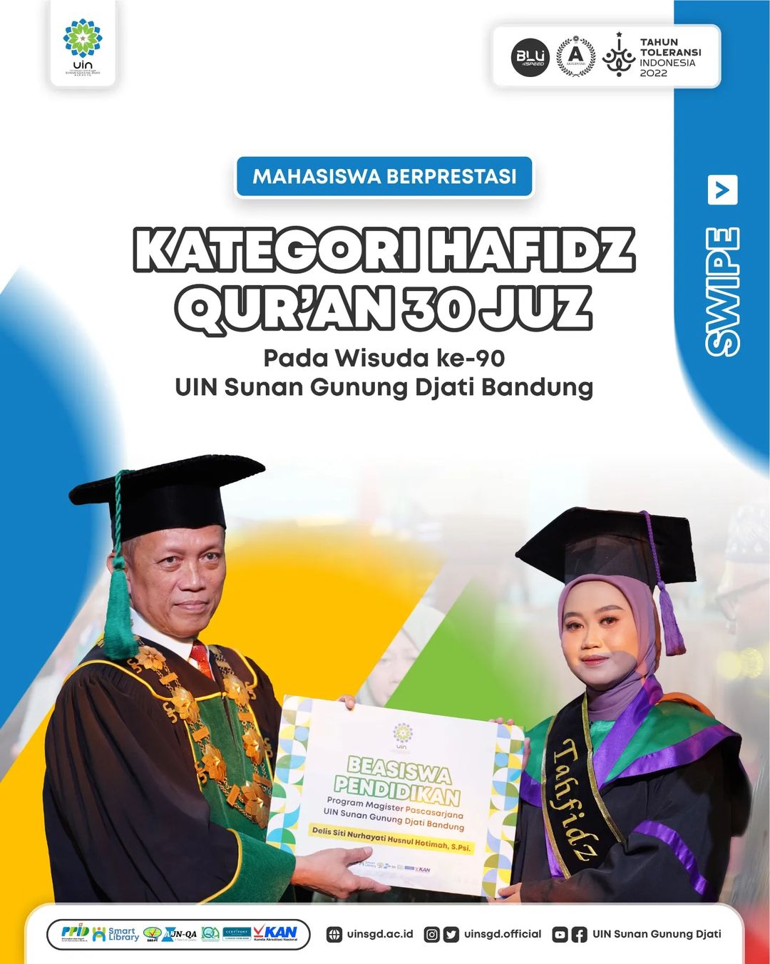 (UINSGD.AC.ID)-Rektor UIN Sunan Gunung Djati Bandung, Prof. Dr. H. Mahmud, M.Si., CSEE melantik 1.000 lulusan dan memberikan penghargaan kepada Edi dan Rizky Irmawan, Jurusan Ilmu Al-Qur’an dan Tafsir Fakultas Ushuluddin; Delis Siti Nurhayati Husnul Hotimah, Jurusan Psikologi Fakultas Psikologi sebagai Wisudawan Tahfidz Al-Qur’an 30 Juz;